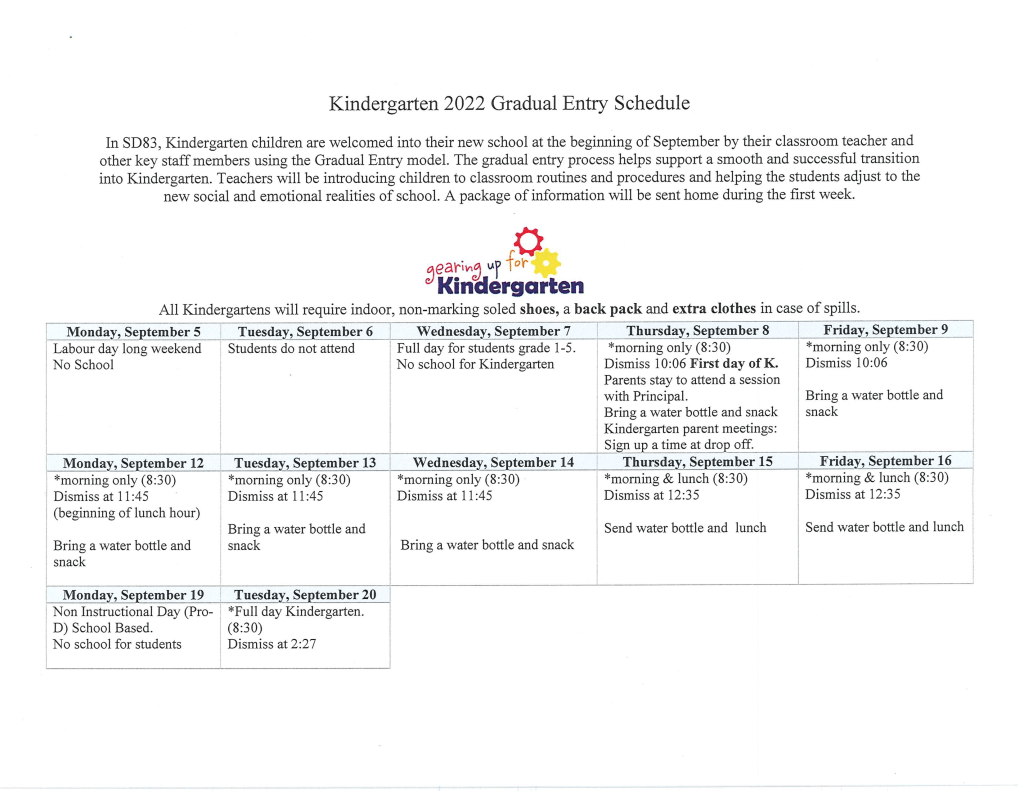 Kindergarten Gradual Entry for 2022-2023